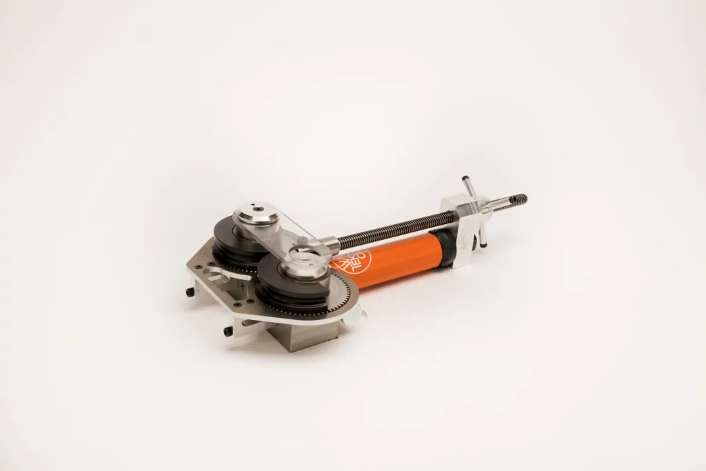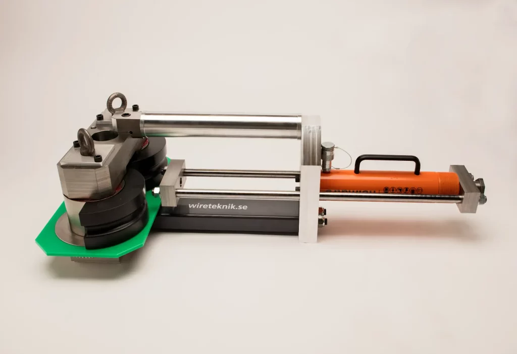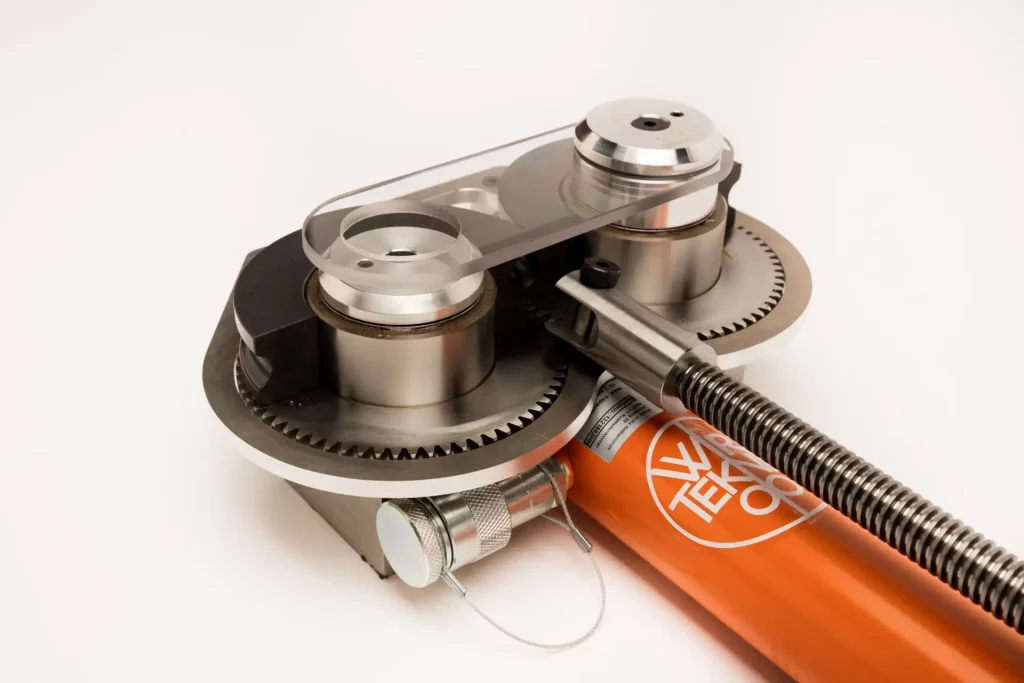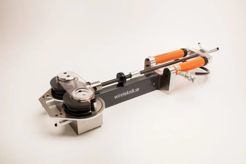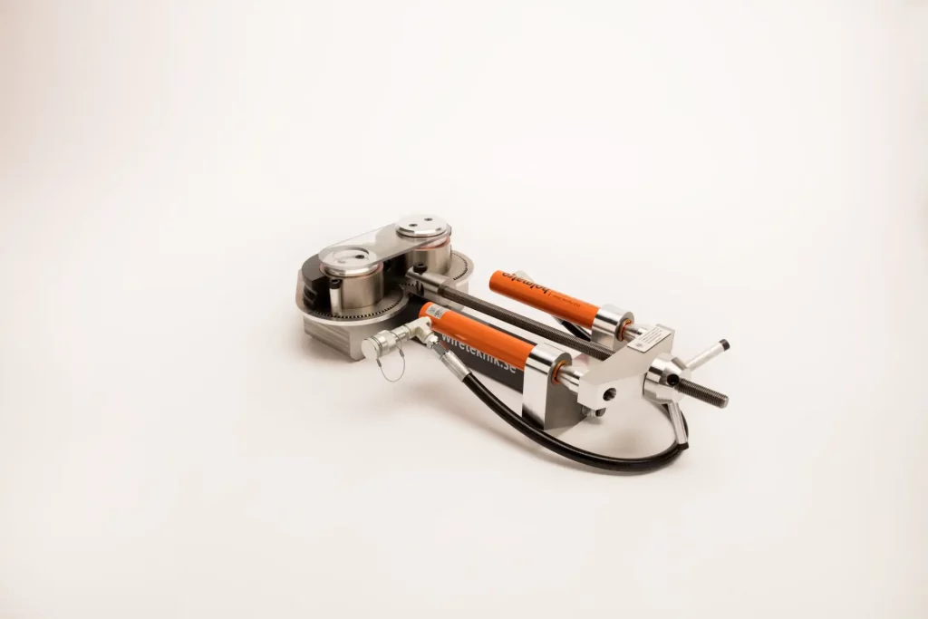 - Choose the pair of roller dies that corresponds to the cable diameter, and slip them onto the cogwheel synchronizing pins. The arrows on the dies should always be in the swaging direction.