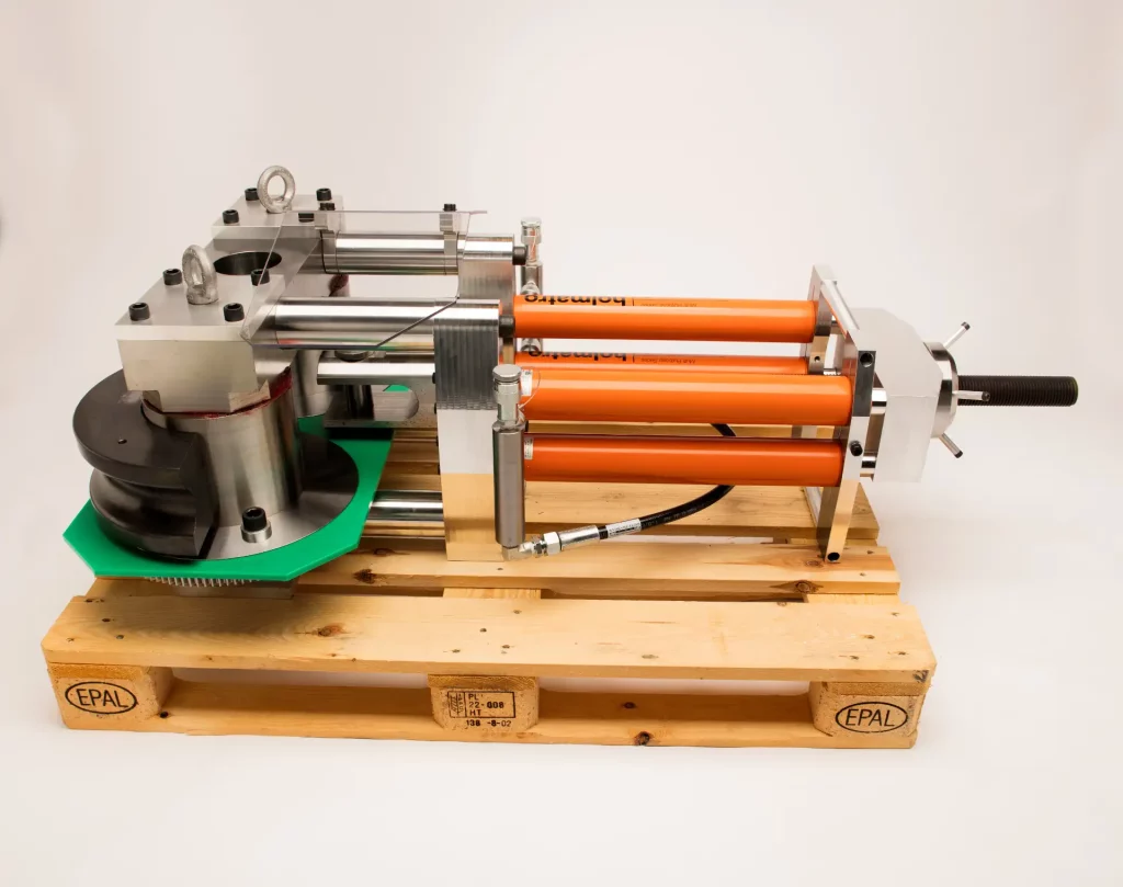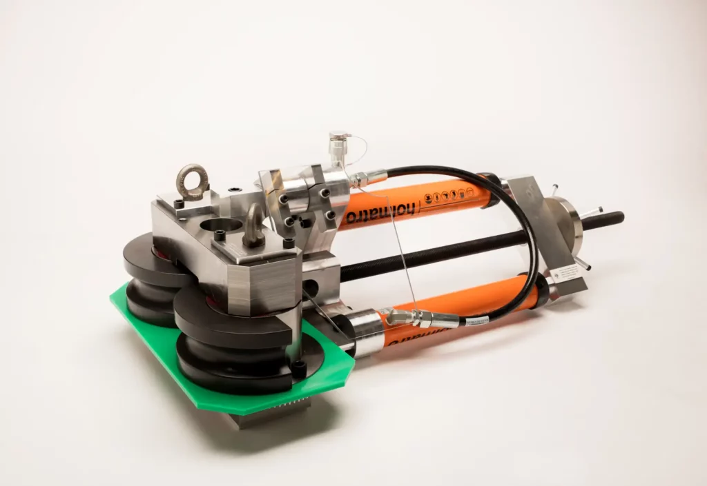 - Move the transparent protective shield into position. Apply hydraulic pressure to draw the terminal between the roller dies.